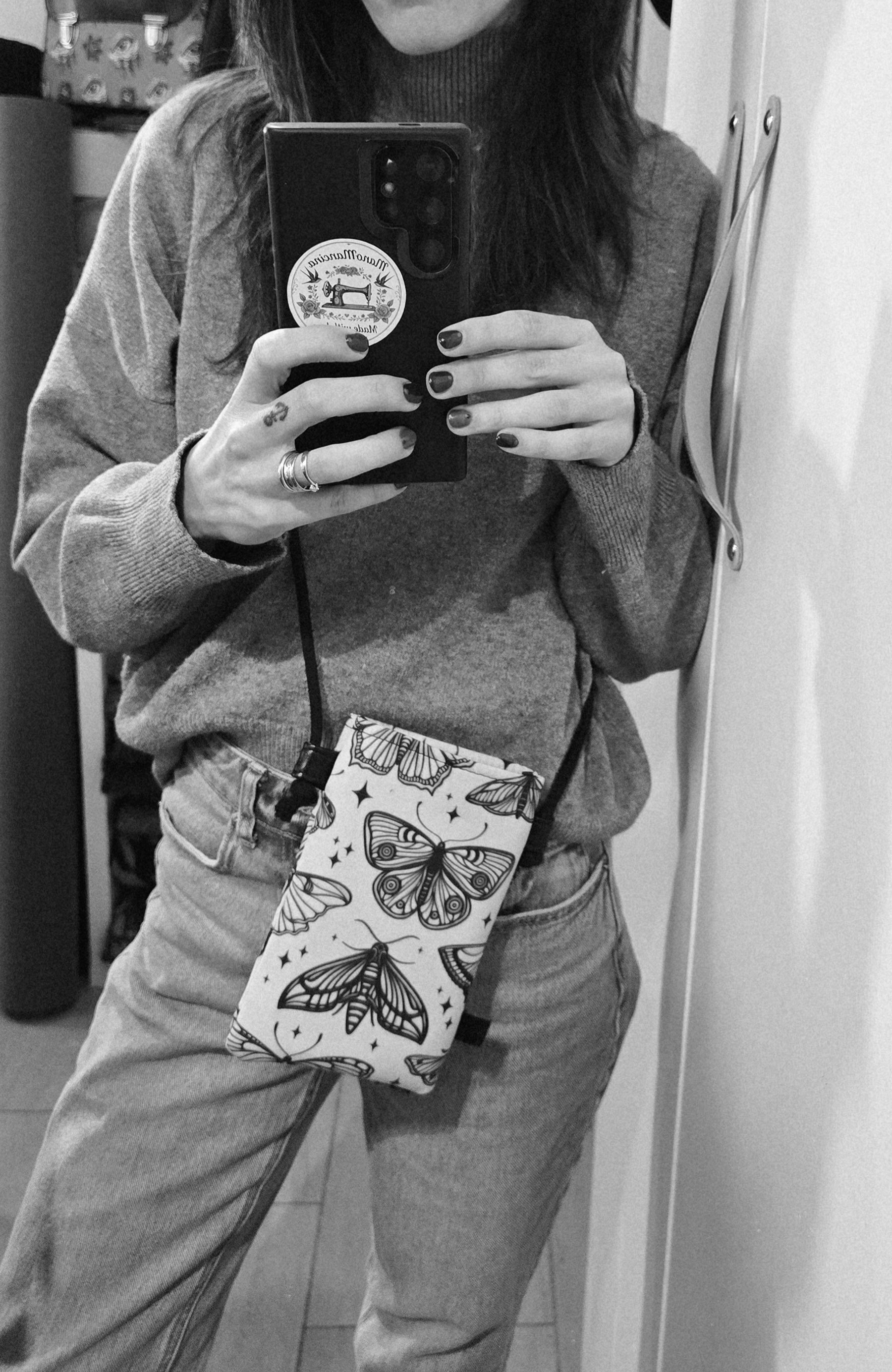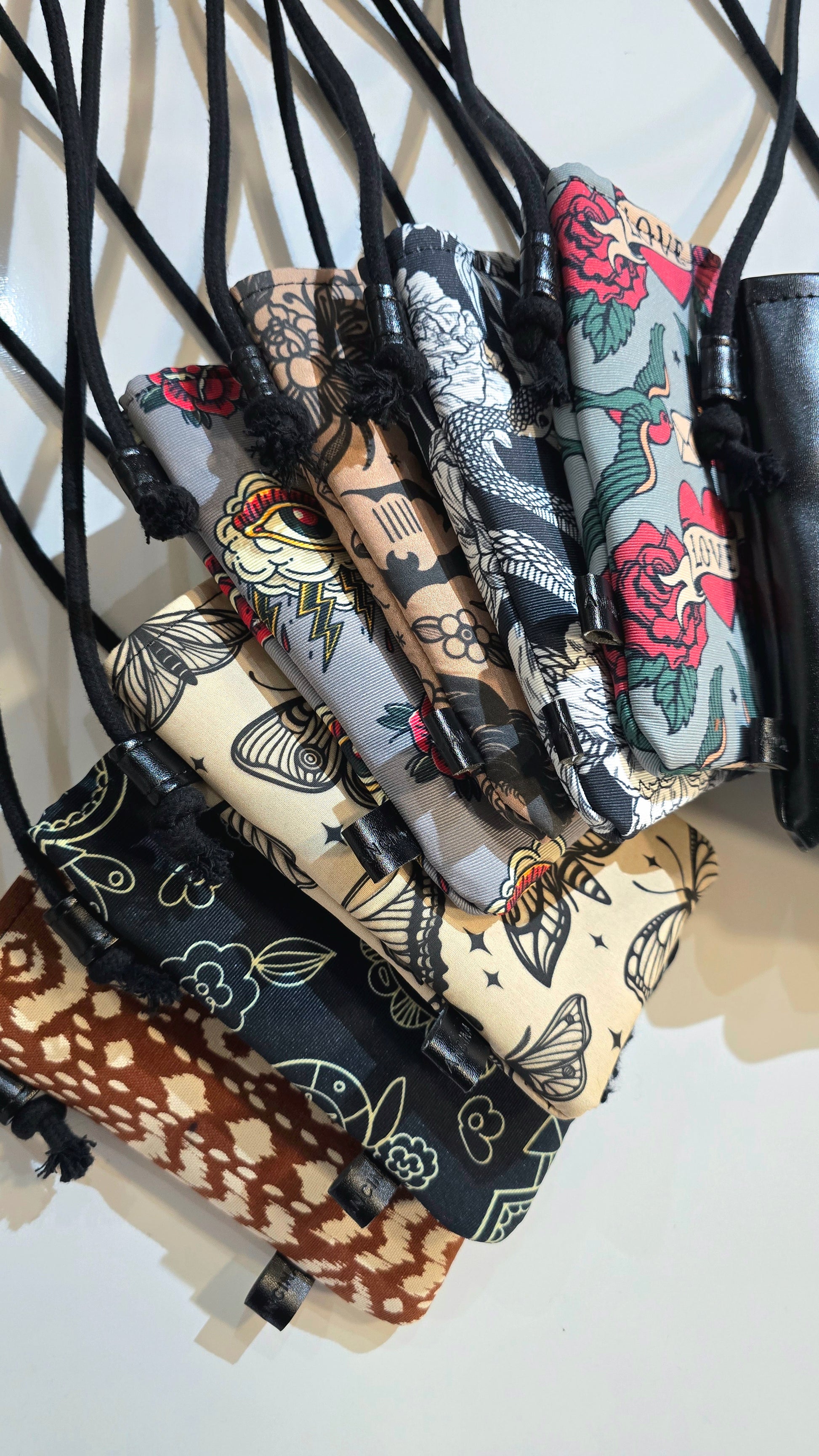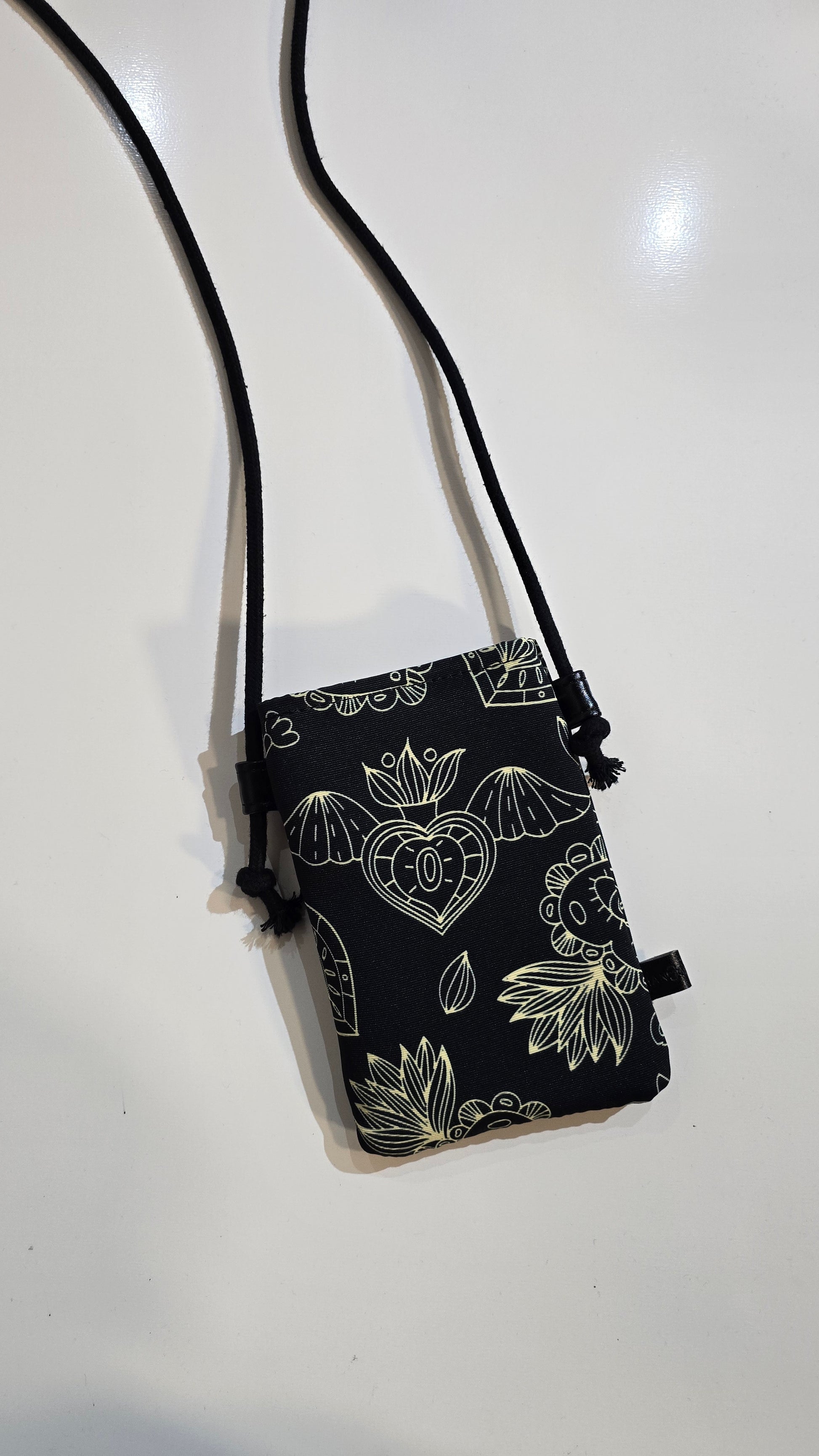 Borsetta porta cellulare misura 13x19cm interno similpelle esterno tessuto fantasia, tracolla Cordino nero 1 cm